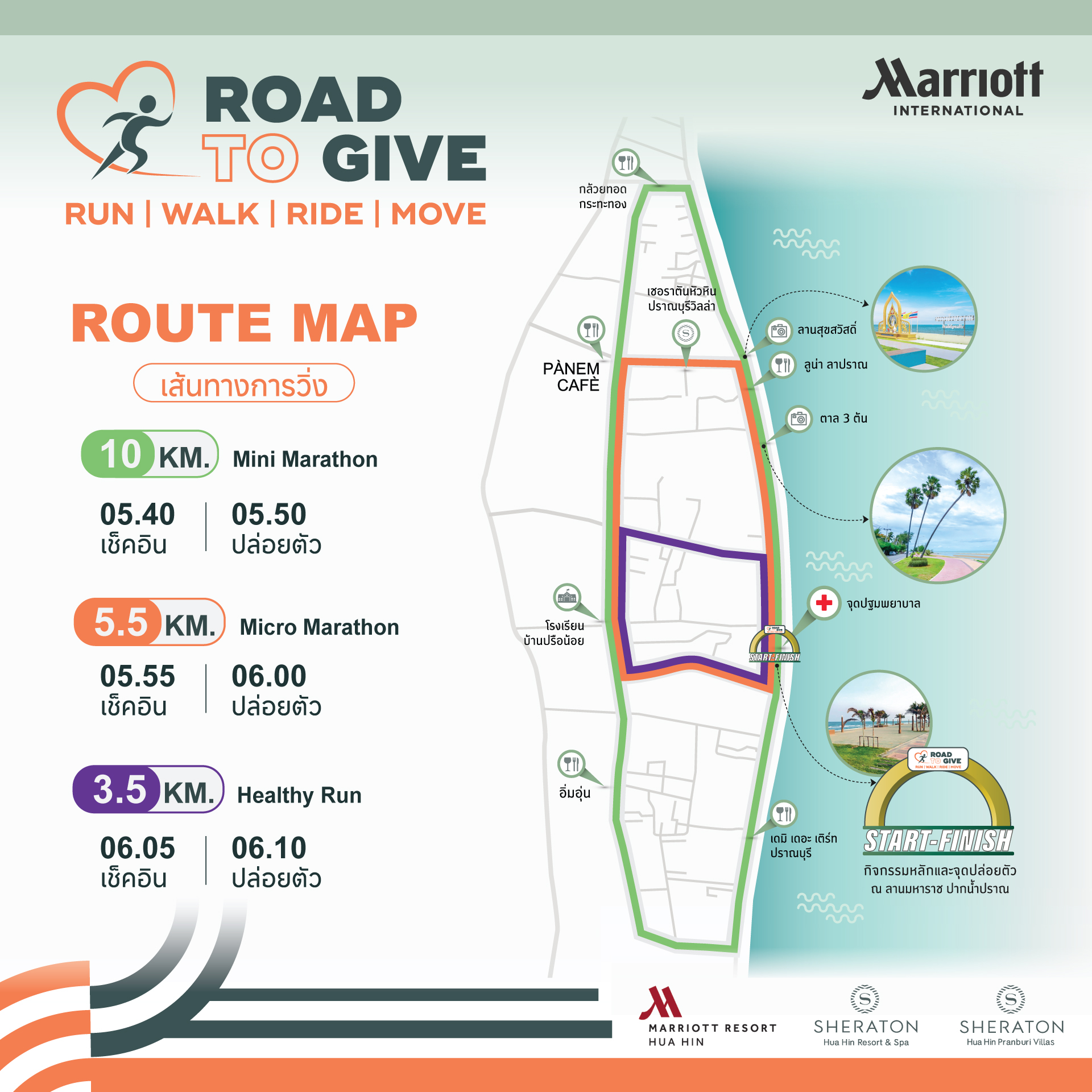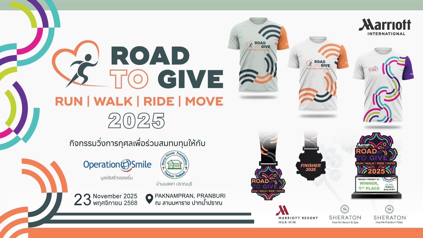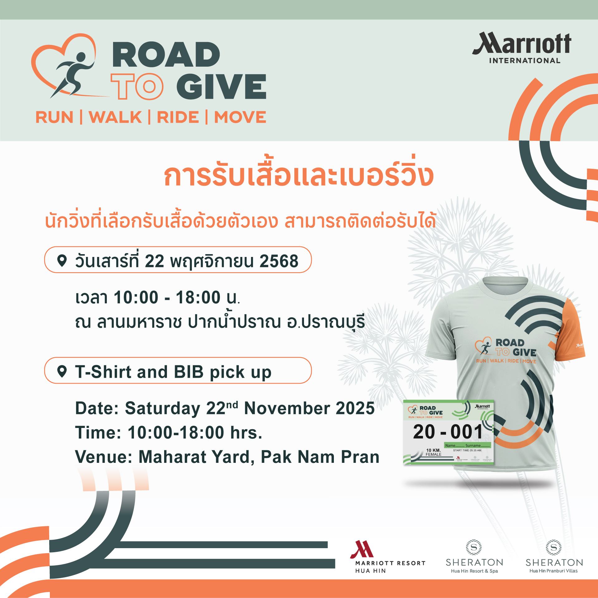 Road to Give Hua Hin 2025 23 พฤศจิกายน 2568 ณ ลานมหาราช ปากน้ำปราณ จ.ประจวบคีรีขันธ์ 👉📍สมัครได้ที่ :รับสมัครทางออนไลน์ โดยโอนเงินค่าสมัครได้ที่ :ชื่อบัญชี : น.ส. ศุภลัคน์ นิปกากร และ น.ส. ธิดารัตน์ อ่ำกลัด และ น.ส. นันทพร ปานเล็ก และ น.ส. กณิกา วันยุมาเลขที่บัญชี : 722-0-79916-0ธนาคาร : ธนาคารกรุงไทย📌เมื่อโอนเงินค่าสมัครแล้ว ให้กรอกรายละเอียดผู้สมัคร/บุคคล/กลุ่ม-ชมรม ตามแบบฟอร์ม สมัครออนไลน์แบบบุคคล (Individual Application) สมัครออนไลน์แบบกลุ่ม/ชมรม (Group Application) ปิดรับสมัคร ตรวจสอบรายชื่อ (Check the List) 📌สมัครแบบonline จัดส่งเสื้อ-BIB ทางไปรษณีย์📌1.กรณีสมัครแบบเดี่ยวค่าจัดส่ง 50 บาท2.กรณีสมัครแบบเป็นกลุ่ม (เลขสมัครเดียวกัน) ค่าจัดส่งตัวแรกคิด 50 บาทตัวต่อไปบวกเพิ่ม ตัวละ 10 บาท ระบบจะคิดค่าจัดส่งให้อัตโนมัติ(** ราคาค่าจัดส่งนี้ เฉพาะเลขที่สมัครเดียวกันเท่านั้น ไม่สามารถรวมกับเลขที่สมัครอื่นได้ ** )_________________________📣ปีนี้เราจัดวิ่ง 3 ระยะค่ะ 📣✅ ระยะ 3.5 กม. Healthy Run✅ ระยะ 5.5 กม. Micro Marathon✅ ระยะ 10 กม. Mini Marathon🎊Running Together 🎉วิ่งไปด้วยกัน ที่ ROAD TO GIVE HUAHIN 2025❣️บริเวณจัดกิจกรรม ลานมหาราช ต.ปากน้ำปราณ อ.ปราณบุรี จ.ประจวบคีรีขันธ์_________________________>>>กด Like กด Share กด Follow กด See first ไว้ จะได้ไม่พลาดข่าวสารจากเรา…💓_________________________🤝หน่วยงานร่วมจัดกิจกรรม🔹 MARRIOTT WORLDWIDE BUSINESS COUNCILS THAILAND🔹 SHERATON Hua Hin Resort & Spa🔹 Hua Hin Marriott Resort and Spa🔹 SHERATON Hua Hin Pranburi Villas😇รายได้หลังหักค่าใช้จ่าย มอบให้🔹 Operation Smile Thailand and Mercy House Foundation – Pranburi ติดต่อสอบถามข้อมูลเพิ่มเติม ได้ที่ : 📞 สอบถามข้อมูลเพิ่มเติม : 032-708000032-904666เวลา 09.00 – 18.00น.เพจงาน : https://www.facebook.com/runtogivehuahin?mibextid=LQQJ4d