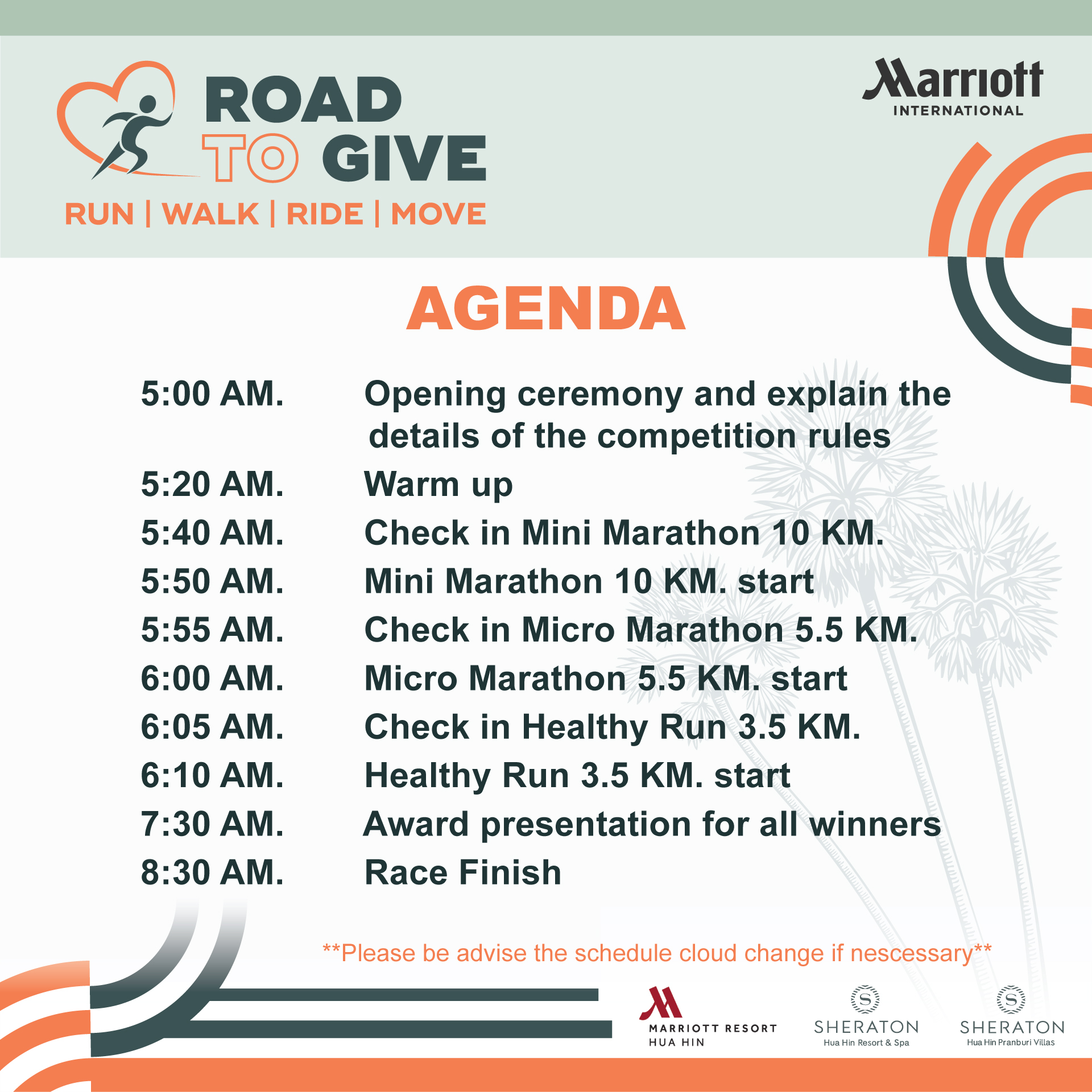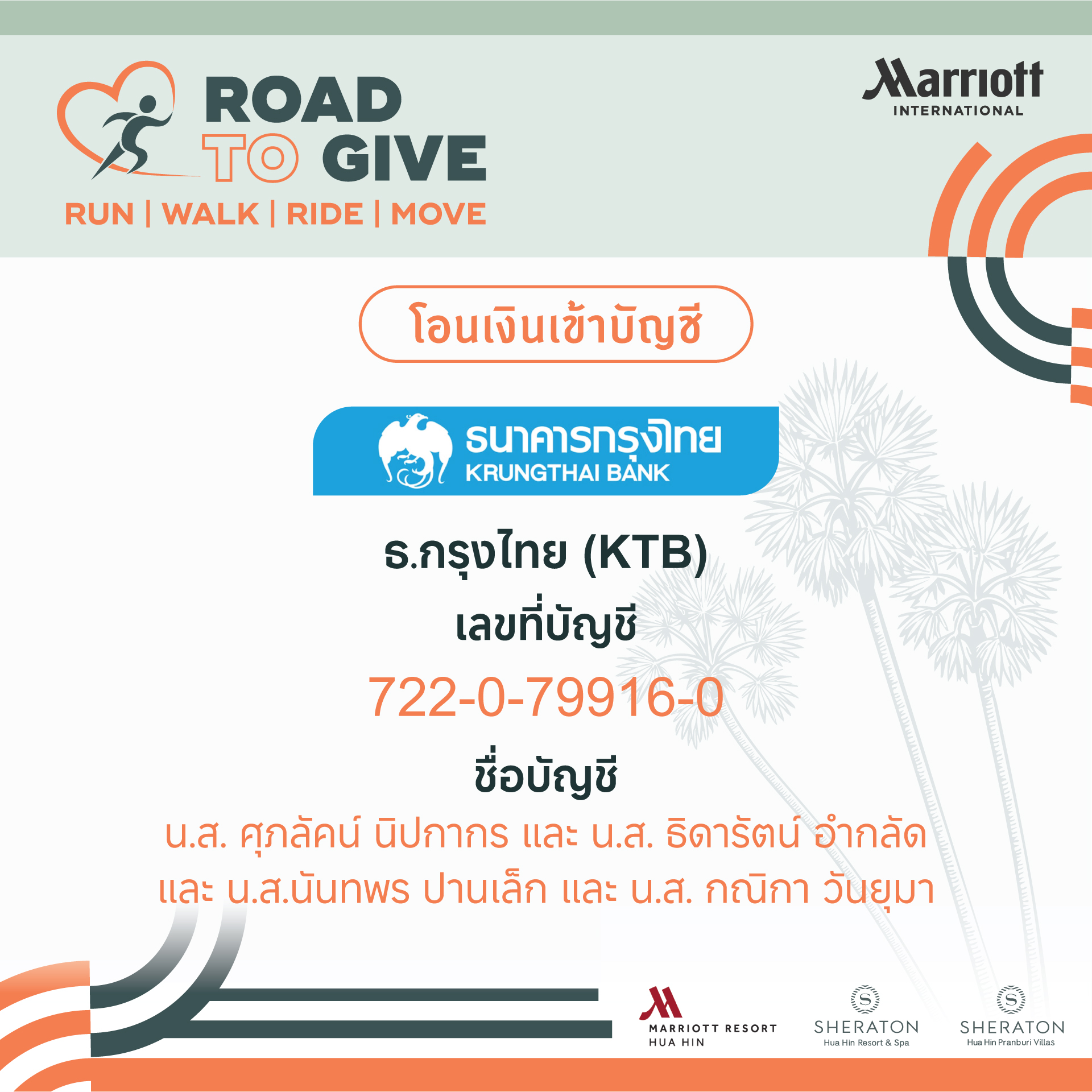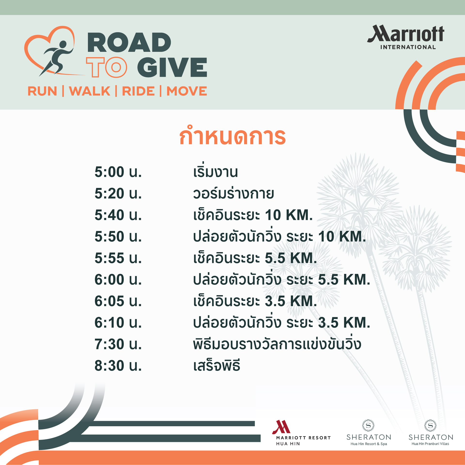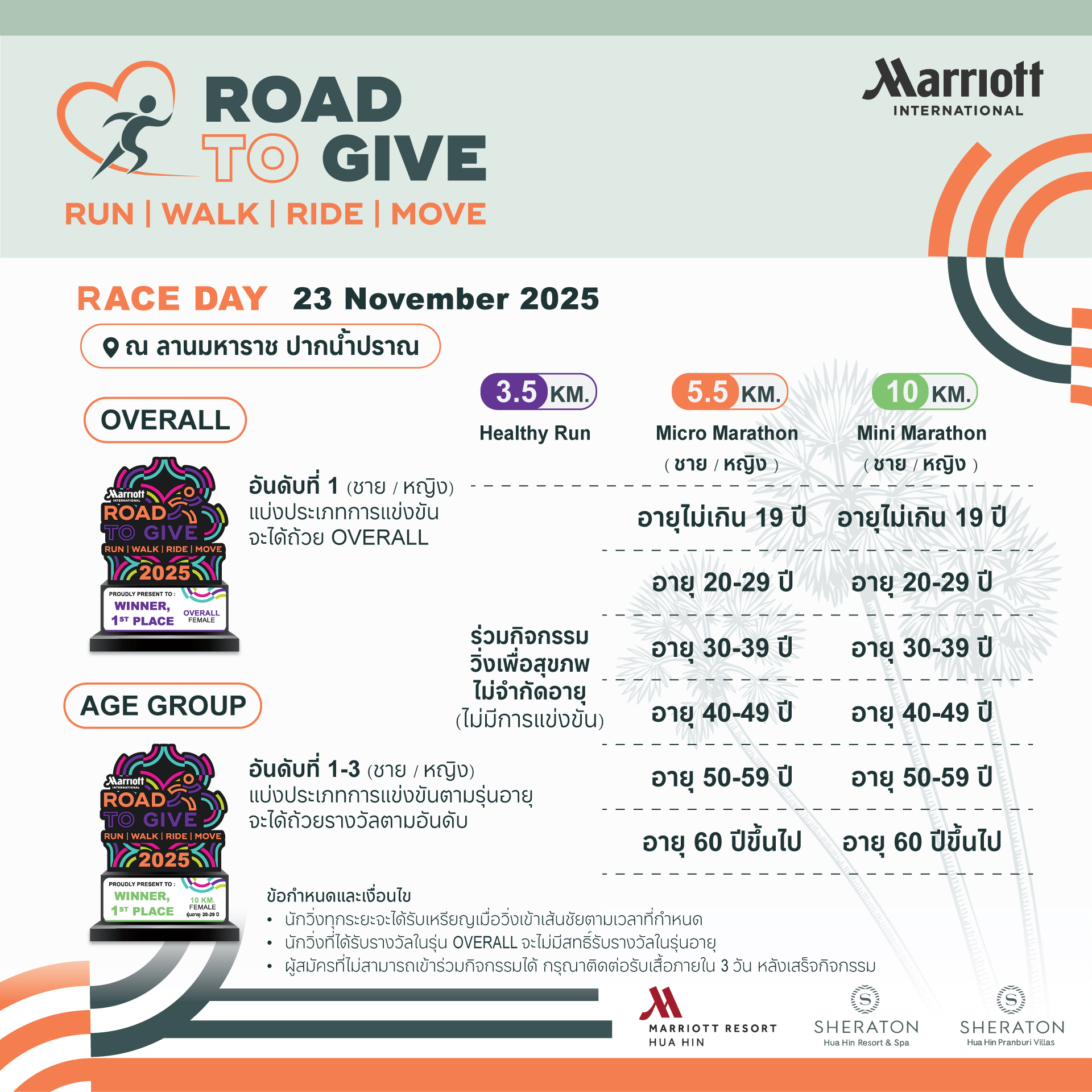 Road to Give Hua Hin 2025 23 พฤศจิกายน 2568 ณ ลานมหาราช ปากน้ำปราณ จ.ประจวบคีรีขันธ์ 👉📍สมัครได้ที่ :รับสมัครทางออนไลน์ โดยโอนเงินค่าสมัครได้ที่ :ชื่อบัญชี : น.ส. ศุภลัคน์ นิปกากร และ น.ส. ธิดารัตน์ อ่ำกลัด และ น.ส. นันทพร ปานเล็ก และ น.ส. กณิกา วันยุมาเลขที่บัญชี : 722-0-79916-0ธนาคาร : ธนาคารกรุงไทย📌เมื่อโอนเงินค่าสมัครแล้ว ให้กรอกรายละเอียดผู้สมัคร/บุคคล/กลุ่ม-ชมรม ตามแบบฟอร์ม สมัครออนไลน์แบบบุคคล (Individual Application) สมัครออนไลน์แบบกลุ่ม/ชมรม (Group Application) ปิดรับสมัคร ตรวจสอบรายชื่อ (Check the List) 📌สมัครแบบonline จัดส่งเสื้อ-BIB ทางไปรษณีย์📌1.กรณีสมัครแบบเดี่ยวค่าจัดส่ง 50 บาท2.กรณีสมัครแบบเป็นกลุ่ม (เลขสมัครเดียวกัน) ค่าจัดส่งตัวแรกคิด 50 บาทตัวต่อไปบวกเพิ่ม ตัวละ 10 บาท ระบบจะคิดค่าจัดส่งให้อัตโนมัติ(** ราคาค่าจัดส่งนี้ เฉพาะเลขที่สมัครเดียวกันเท่านั้น ไม่สามารถรวมกับเลขที่สมัครอื่นได้ ** )_________________________📣ปีนี้เราจัดวิ่ง 3 ระยะค่ะ 📣✅ ระยะ 3.5 กม. Healthy Run✅ ระยะ 5.5 กม. Micro Marathon✅ ระยะ 10 กม. Mini Marathon🎊Running Together 🎉วิ่งไปด้วยกัน ที่ ROAD TO GIVE HUAHIN 2025❣️บริเวณจัดกิจกรรม ลานมหาราช ต.ปากน้ำปราณ อ.ปราณบุรี จ.ประจวบคีรีขันธ์_________________________>>>กด Like กด Share กด Follow กด See first ไว้ จะได้ไม่พลาดข่าวสารจากเรา…💓_________________________🤝หน่วยงานร่วมจัดกิจกรรม🔹 MARRIOTT WORLDWIDE BUSINESS COUNCILS THAILAND🔹 SHERATON Hua Hin Resort & Spa🔹 Hua Hin Marriott Resort and Spa🔹 SHERATON Hua Hin Pranburi Villas😇รายได้หลังหักค่าใช้จ่าย มอบให้🔹 Operation Smile Thailand and Mercy House Foundation – Pranburi ติดต่อสอบถามข้อมูลเพิ่มเติม ได้ที่ : 📞 สอบถามข้อมูลเพิ่มเติม : 032-708000032-904666เวลา 09.00 – 18.00น.เพจงาน : https://www.facebook.com/runtogivehuahin?mibextid=LQQJ4d